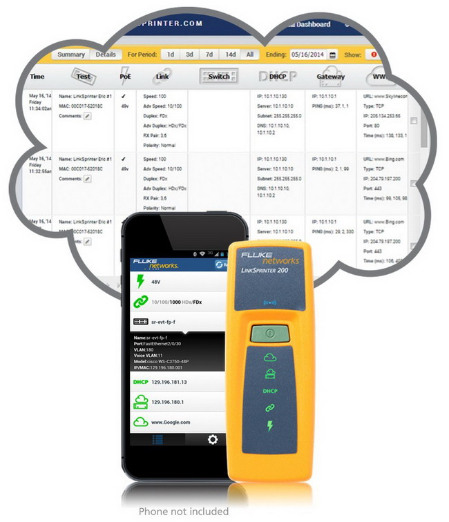 Both models provide PoE, link, DHCP, gateway and service testing via color graded LEDs as well as LinkSprinter Cloud Service. The model 200 includes a built in Wi-Fi access point allowing your phone or tablets browser to display detailed test results making network troubleshooting more effective.